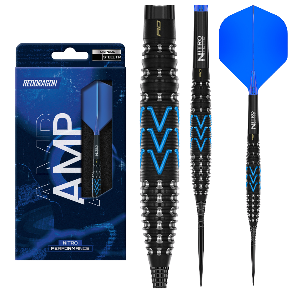 Ignite your game with the Red Dragon Amp Darts. A high-energy range featuring voltage-style mid-barrel milling for enhanced grip, control, and style.