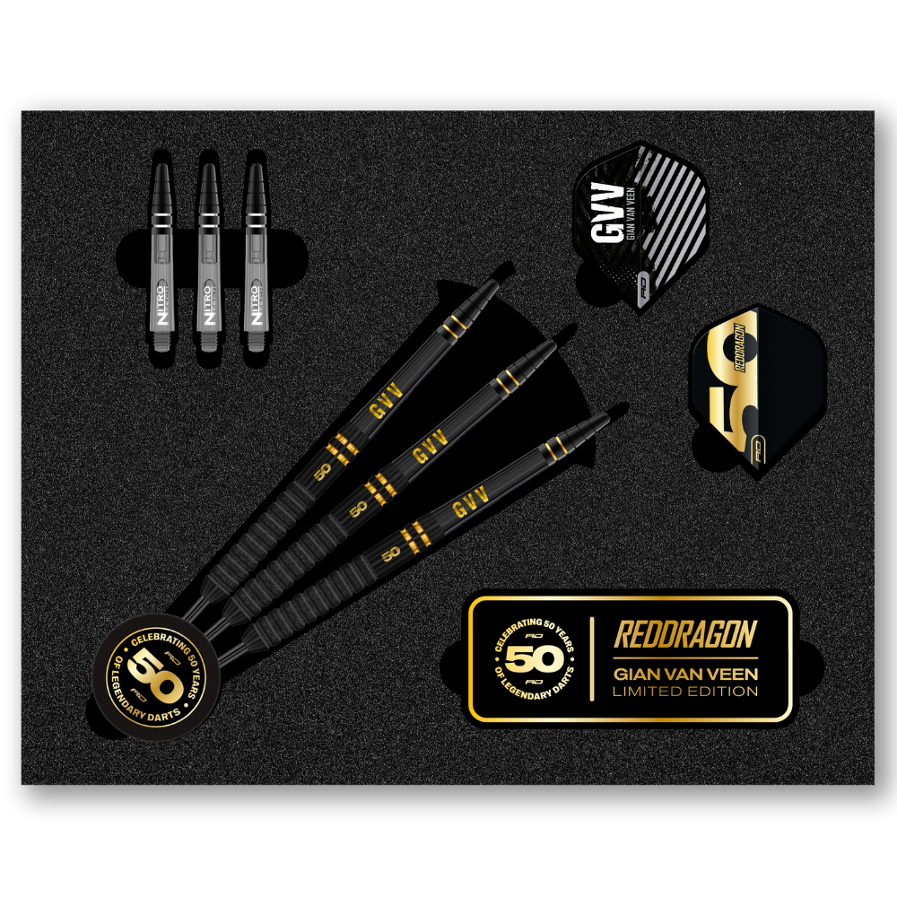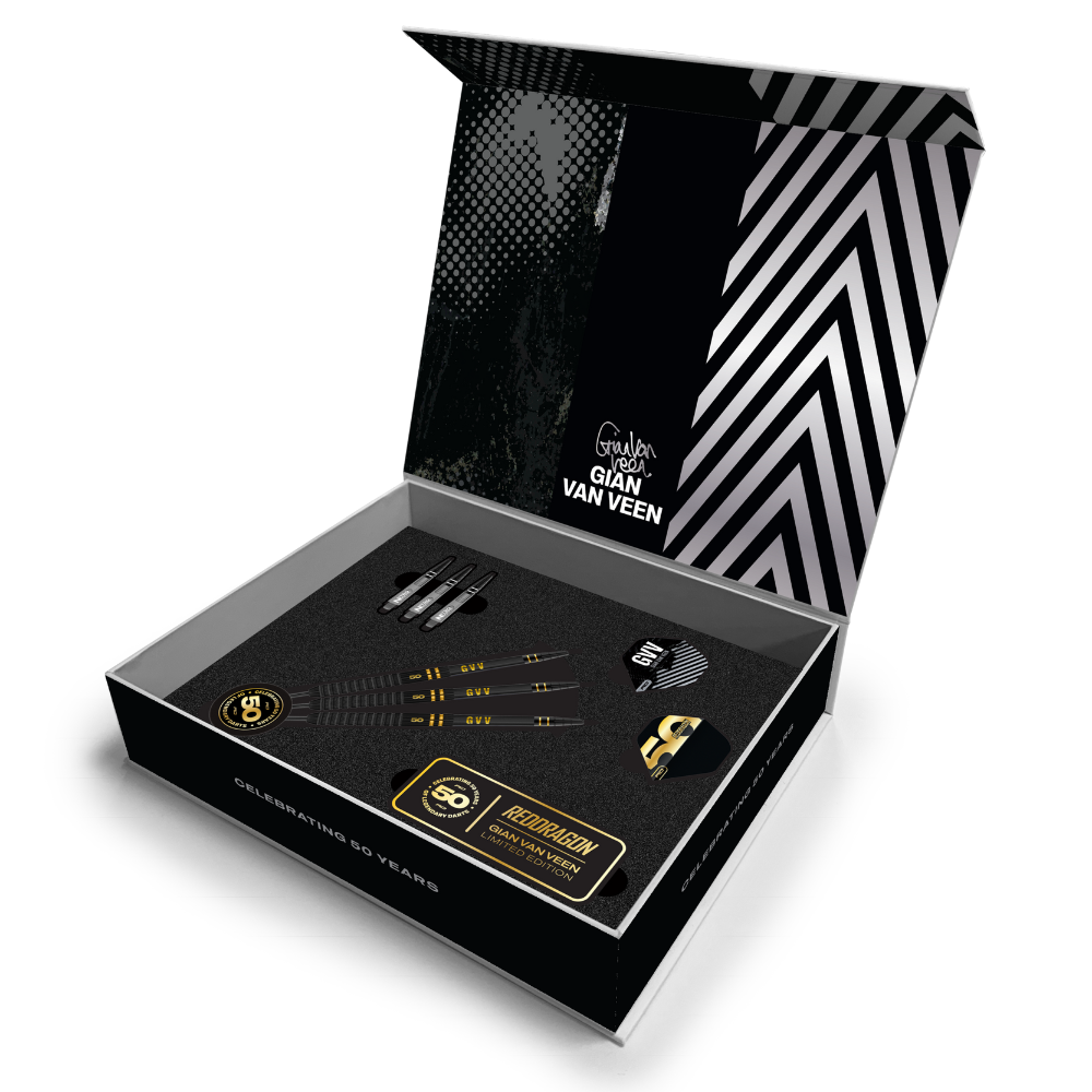 Gian van Veen – 50 Year Limited Edition Dart Gian van Veen has captured the darting world’s attention with his fearless talent and high-octane pace. This 50-Year Limited Edition celebrates his rise with his exact playing darts, enhanced with a bold black Onyx finish and gold detailing to match the golden future ahead for Gian.