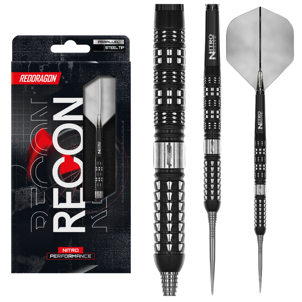 Command the oche with Red Dragon Recon Darts – precision-engineered in striking black and silver. Featuring advanced technical milling with angled grip cuts for ultimate control, balance, and accuracy.