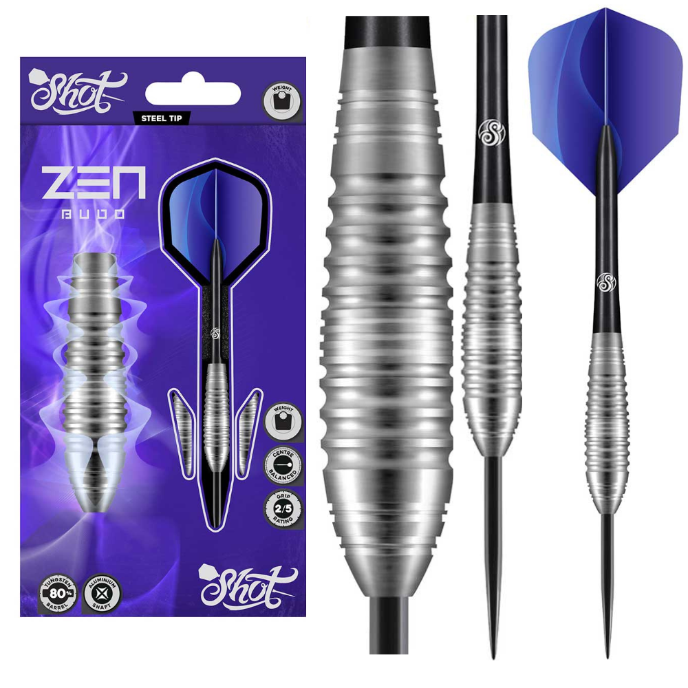 In a chaotic world – Zen is the pursuit of calm through the joy of the perfect game. This straightforward series of quality tungsten darts is crafted with pure precision at the Shot Darts factory in New Zealand. Zen barrels feature classic ring grips and push points to suit most players and throwing styles.