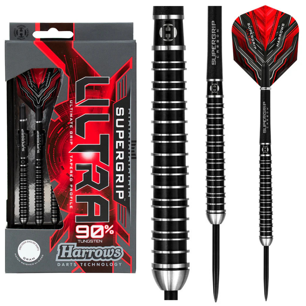 The Harrows Supergrip Ultra darts feature 90% tungsten barrels with a front-tapered design, offering a comfortable and controlled throw, and a distinctive grip pattern combining deep single and dual rings for the signature Supergrip feel. Finished with a durable black coating and precision re-cut detailing, they come fitted with Silver Supergrip Carbon shafts and 100-micron Supergrip Ultra flights, and are match-weighed to ±0.05 g for consistency